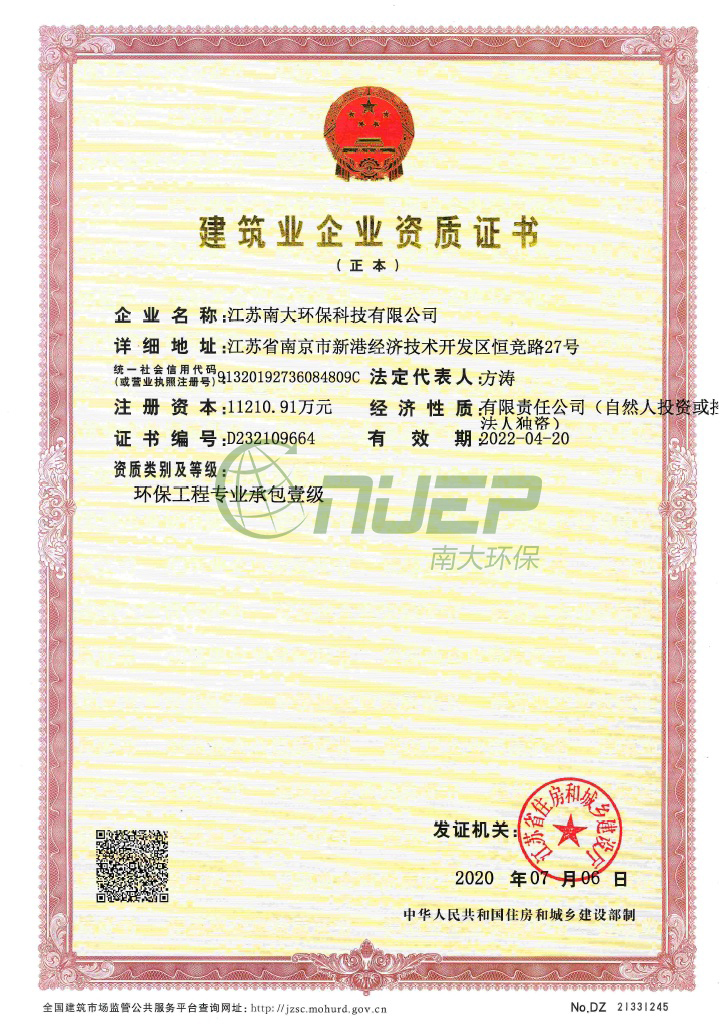 近日,江蘇南大環保科技有限公司成功通過江蘇省住建廳環保工程一級施工資質申報審核,取得了環保工程專業承包壹級資質證書。
